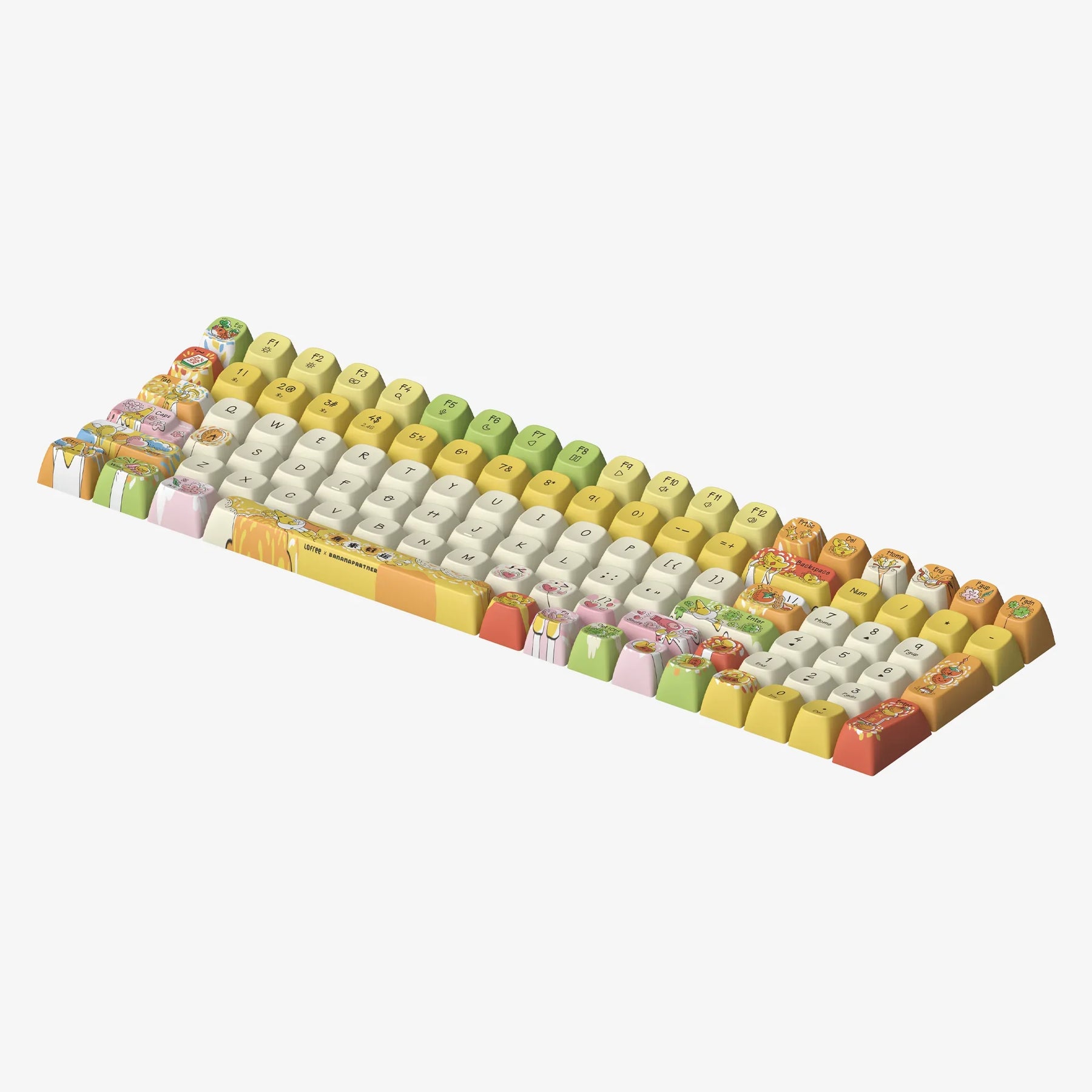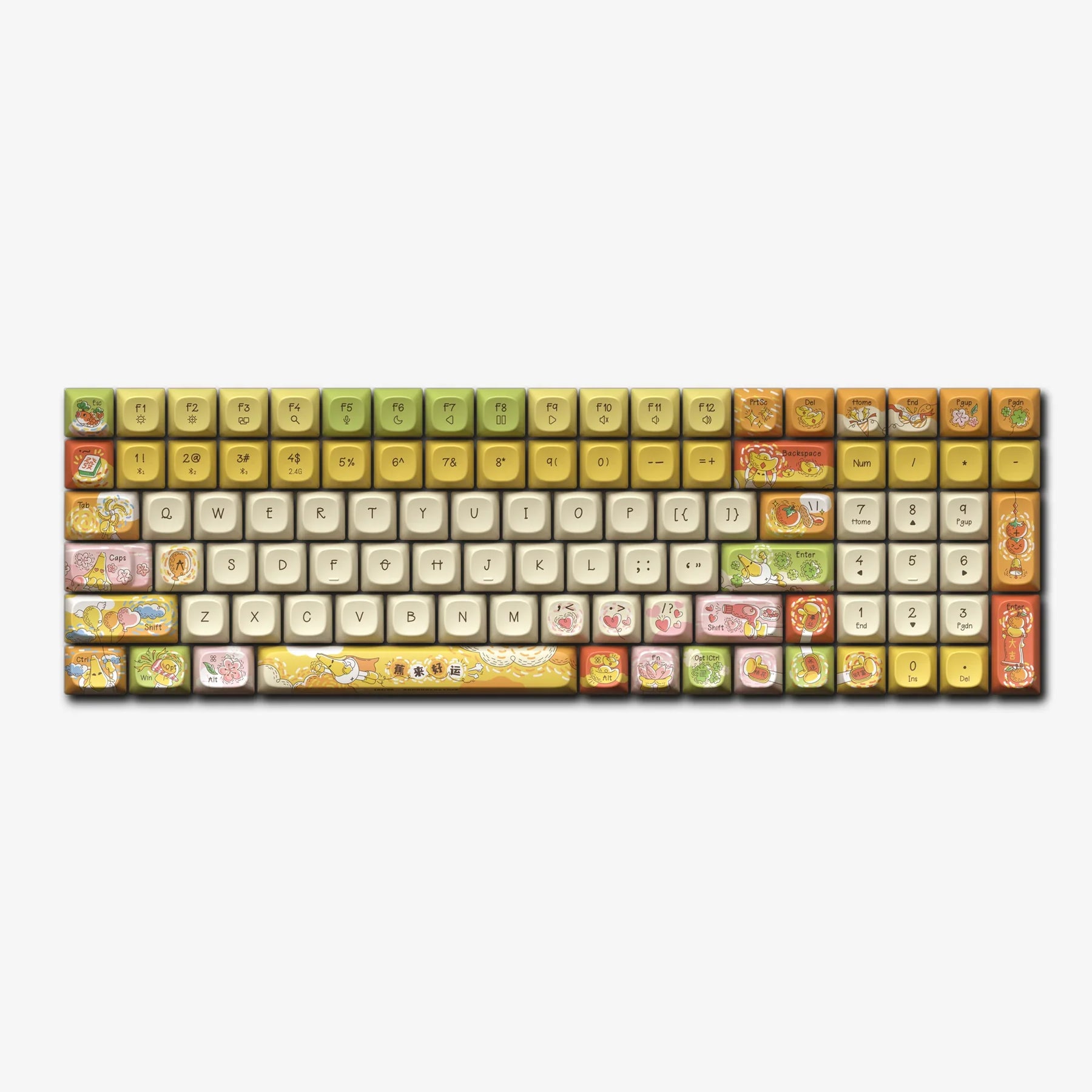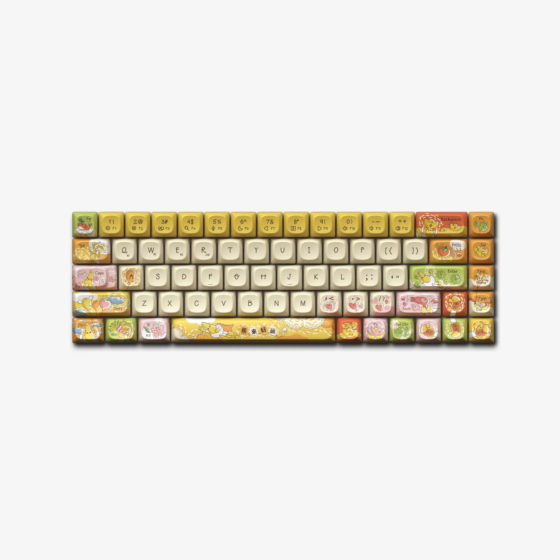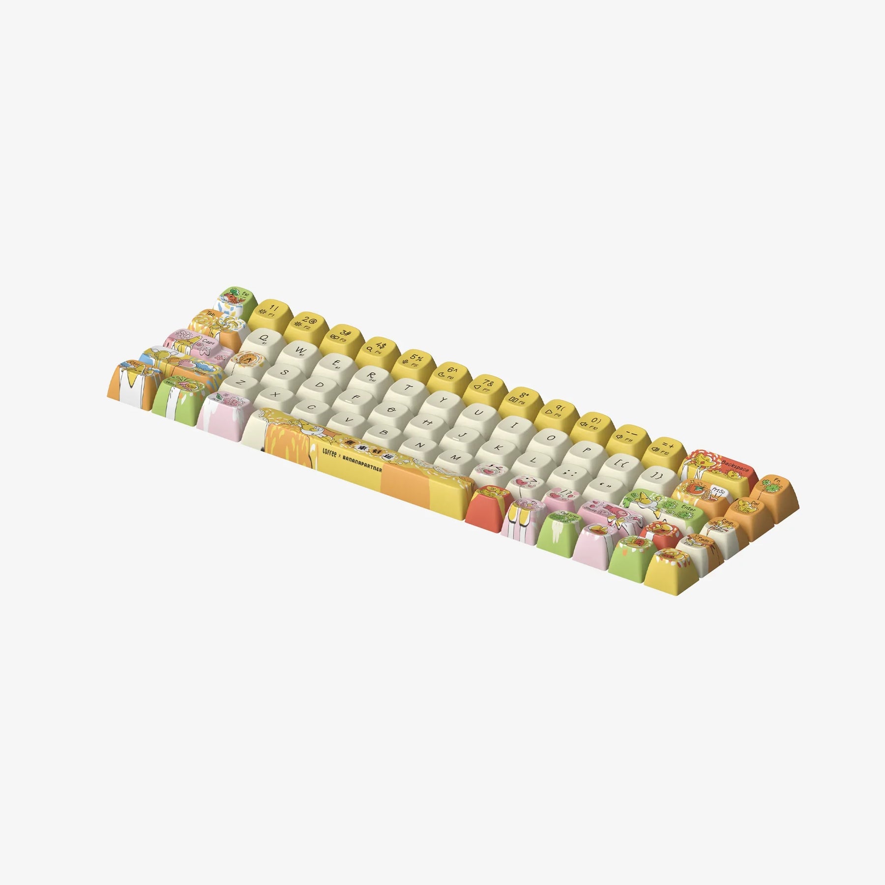 Featuring "Lucky Banana," the beloved icon from Banana Design. This design showcases Banana Head in its classic beckoning pose, a symbol of welcoming Fortune in China. The set of keycaps also blends some elements from traditional Chinese culture believed to attract luck: oranges for immense fortune, the beckoning gesture with gold coins and ingots for financial prosperity, four-leaf clover for good fortune and peach blossoms with hearts for love luck. This set of keycaps promises to bring a flow of luck into your daily life.