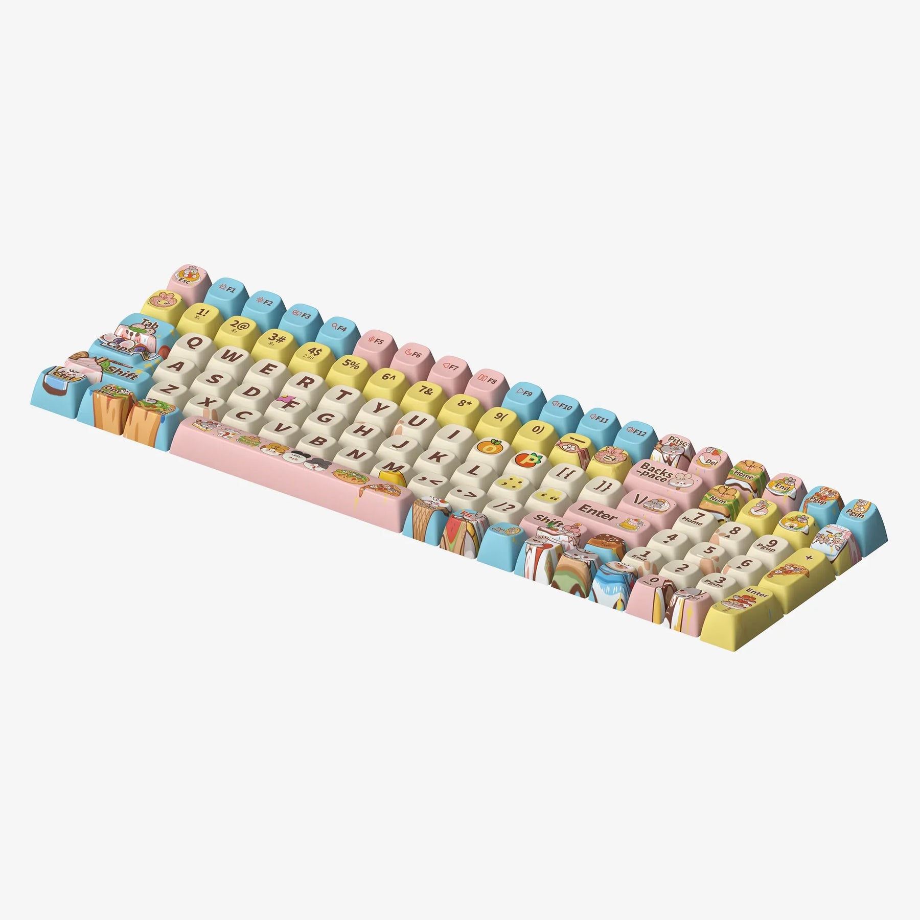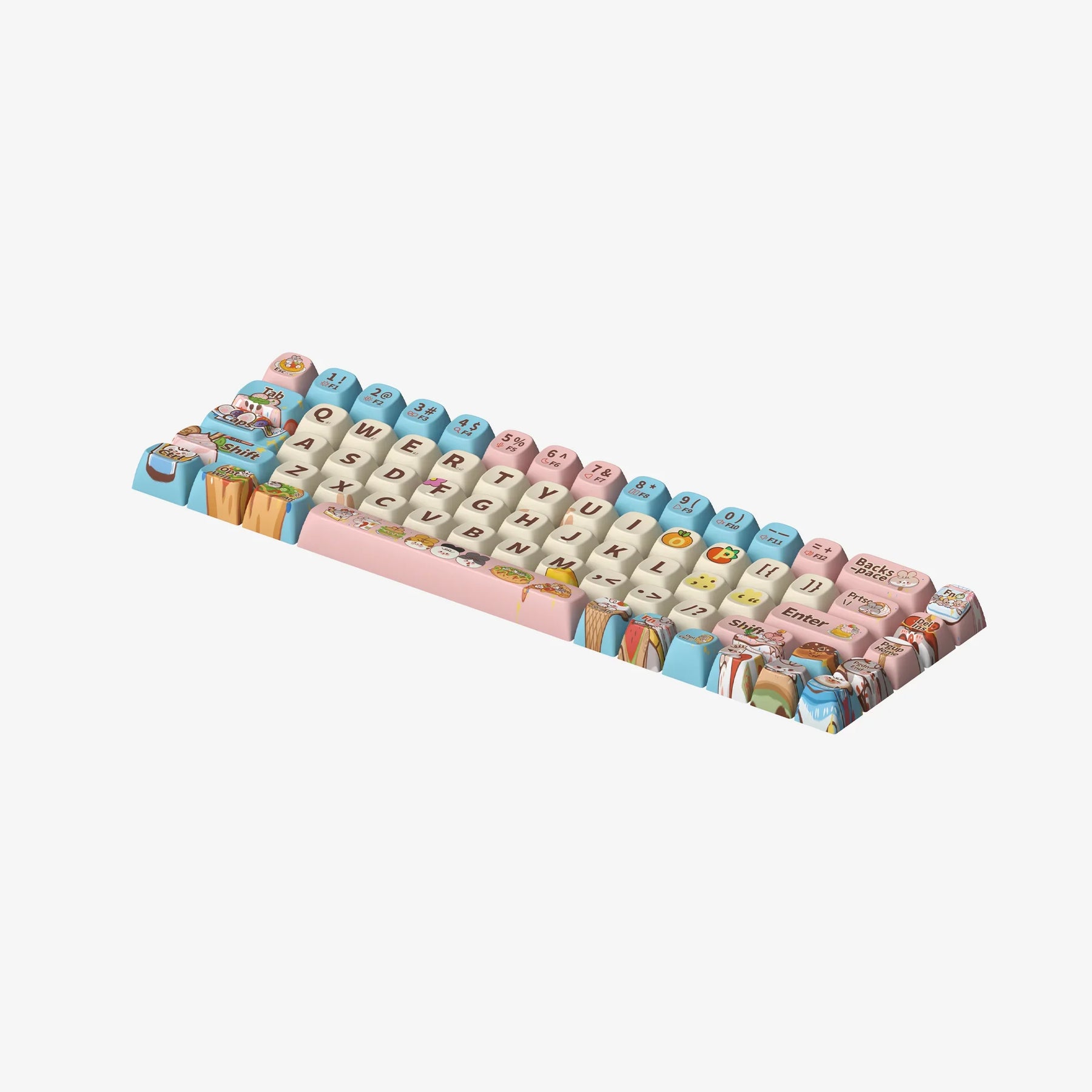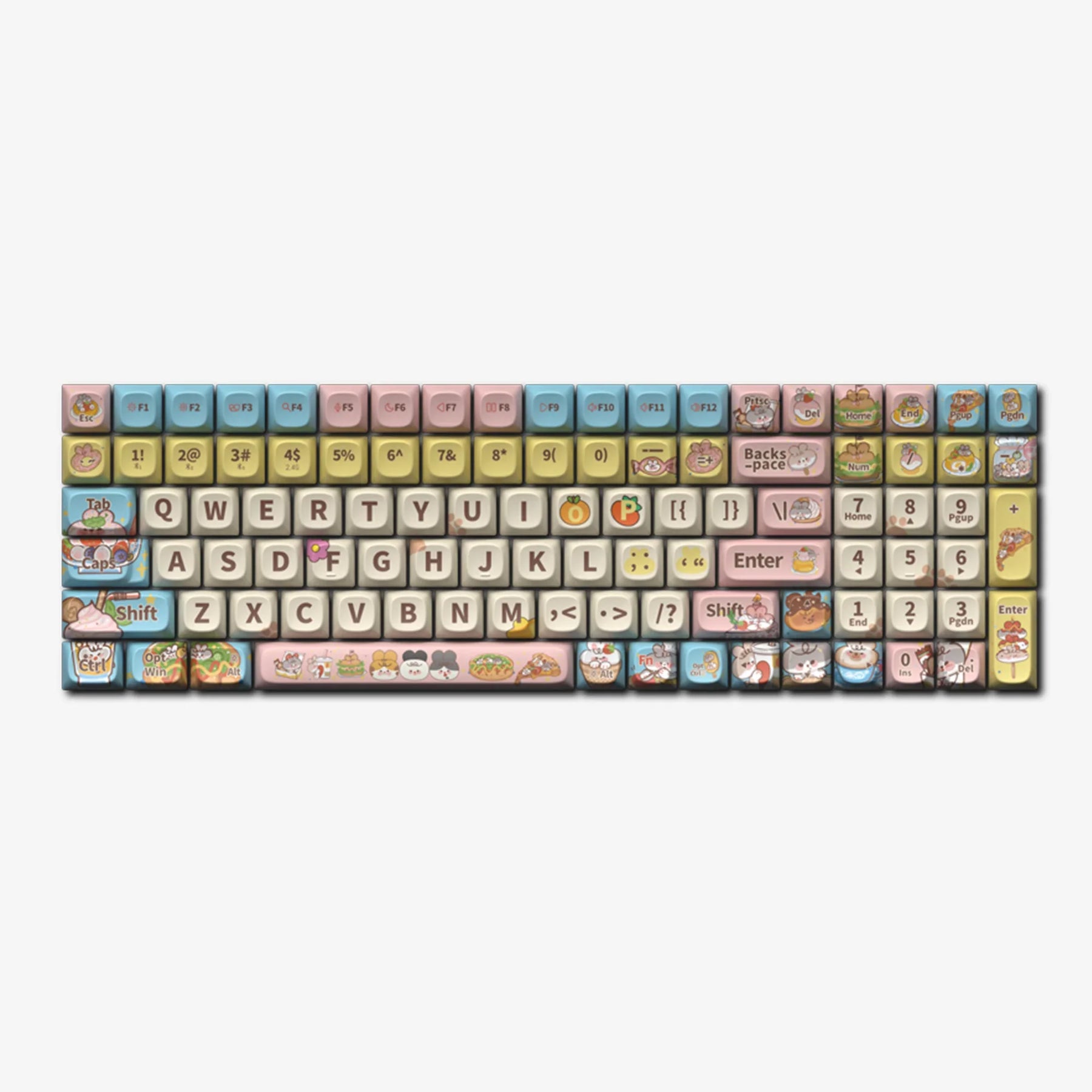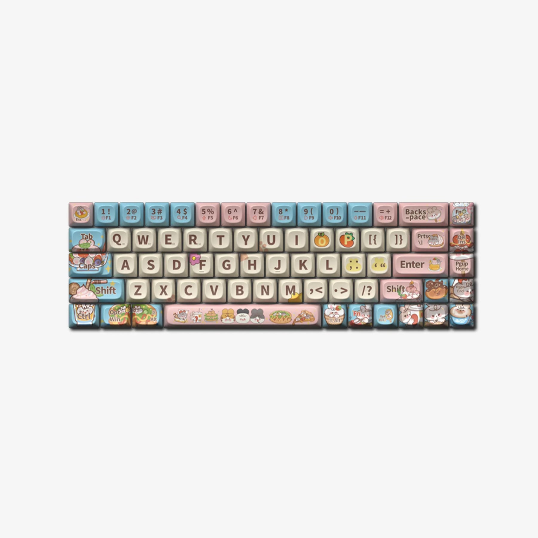 Indulge in the delightful fusion of rabbit and culinary themes with our "Rabbit Chef's Feast" keycaps. They feature cute rabbit designs paired with favorite snacks like milk tea, hamburgers, pizza, candy, and donuts. The lively pastel blue color scheme enhances the girlish, making every keystroke dreamy and sweet.