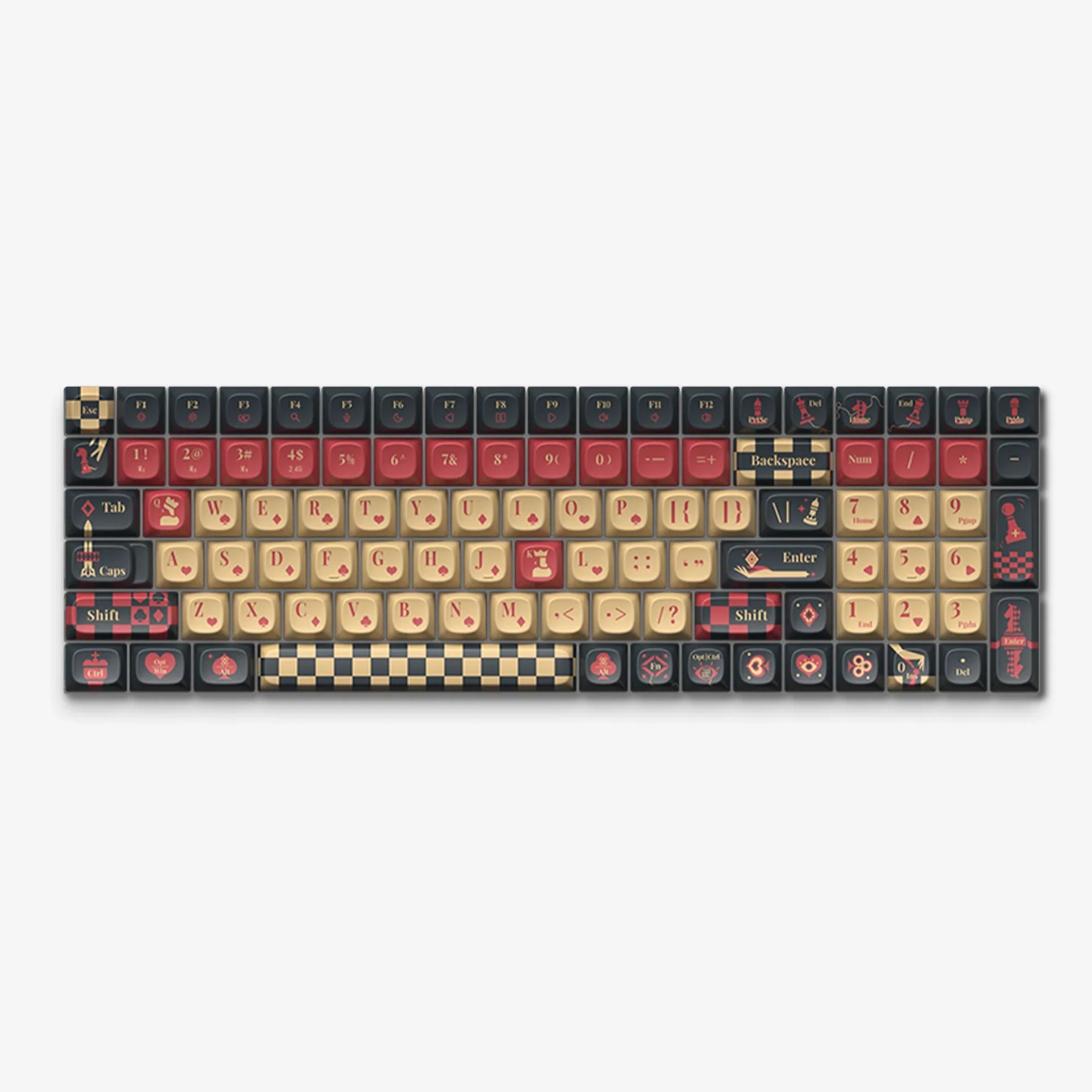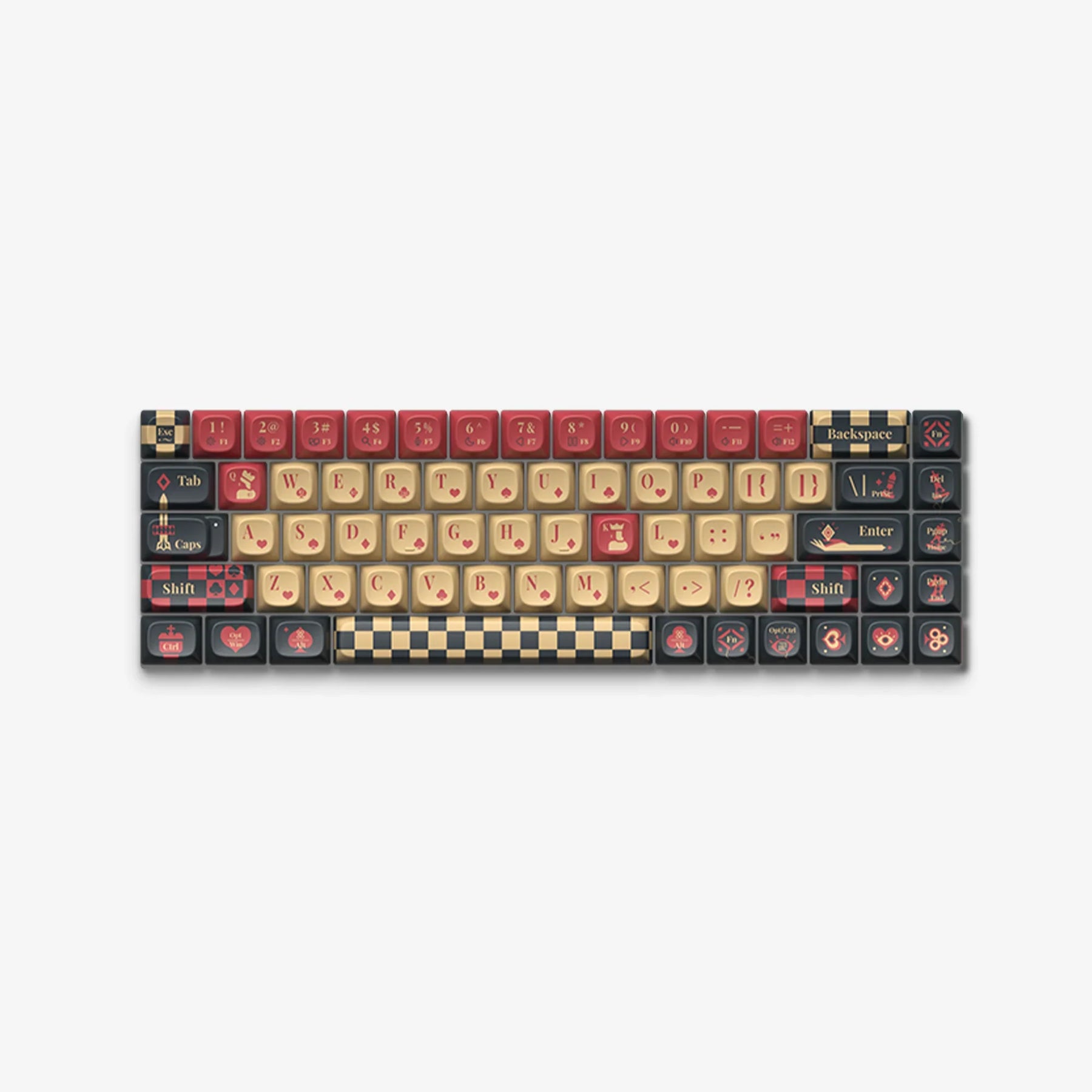 Welcome to the Chessboard Kingdom, a fantastical realm where the suits of cards and pieces of chess converge under the rule of King K and Queen Q. In this innovative kingdom, the four suits of poker, clubs, hearts, spades and diamonds merge with the chess pieces, rook, bishop, pawn, knight, to create a playful and immersive experience. Breaking away from the traditional black and white, our keycaps dazzle in a vibrant mix of red, yellow, and black, offering endless possibilities. As life mirrors a game of chess, these keycaps remind us to find our place and shape our destinies in the colorful kingdom.